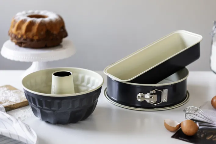 Das Backform-Set „INSPIRATION PLUS“ von Kaiser – WMF bietet eine vielseitige Lösung für alle Backbegeisterten. Das Set besteht aus drei Teilen: einer Königskuchenform, einer Bundform und einer Springform. Die Hauptfarbe des Sets ist Schwarz, kombiniert mit einem eleganten Weiß im Inneren, was den Formen ein modernes und ansprechendes Design verleiht. Die Formen sind aus hochwertiger Keramik gefertigt, was eine gleichmäßige Wärmeverteilung und hervorragende Backergebnisse gewährleistet. Das Set ist backofengeeignet und bietet somit Flexibilität für unterschiedliche Rezepte. Die robuste Konstruktion sorgt für Langlebigkeit und einfache Handhabung. Dieses Set ist nicht nur funktional, sondern auch ein stilvolles Element in jeder Küche.