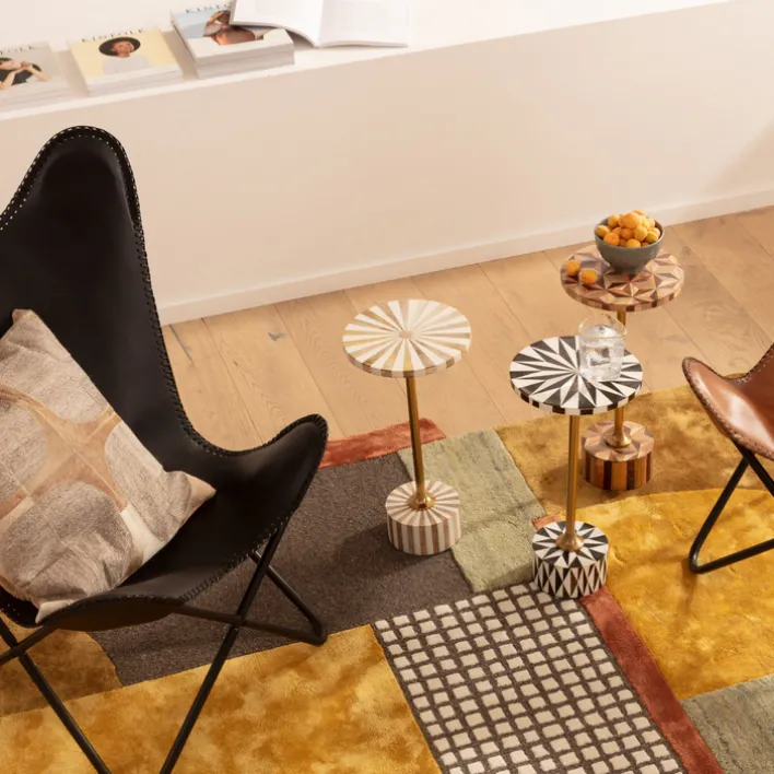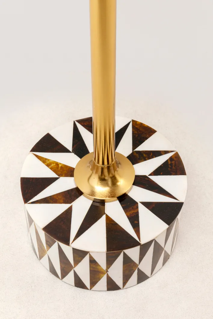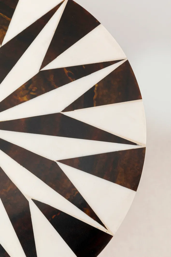 Der Beistelltisch DOMERO STAR vereint modernes Design mit funktionaler Eleganz. Mit einer Höhe von 50 cm und einem Durchmesser von 25 cm ist er kompakt und vielseitig einsetzbar. Der Tisch besteht aus robustem Stahl, was ihm Stabilität und Langlebigkeit verleiht. Die mehrfarbige Tischplatte zeigt ein auffälliges geometrisches Muster in Schwarz und Weiß, das durch die goldene Tischsäule stilvoll ergänzt wird. Diese Kombination aus Farben und Materialien macht den Tisch zu einem Blickfang in jedem Raum.