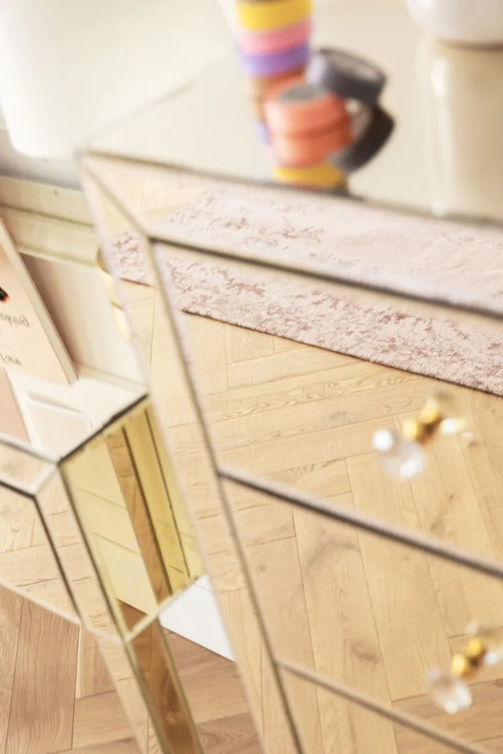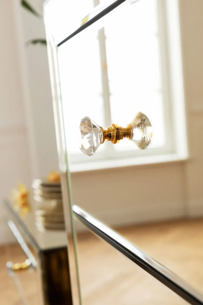 Der Korpus der Hochkommode ist aus einer mitteldichten Faserplatte mit lackierter Oberfläche gefertigt. In Verbindung mit Füßen aus massivem Tannenholz, einer verspiegelten Front sowie Griffen aus klarem Glas ist die KARE DESIGN Hochkommode ein absolutes Schmuckstück in allen Wohnräumen. Die fünf Schubkästen bieten reichlich Stauraum zur Aufbewahrung von Wäschestücken, Kleidungsaccessoires und anderen Gegenständen des täglichen Bedarfs. Durch ihre geringe Breite ist die Hochkommode ein idealer Ordnungshüter auch in kleinen Fluren oder im Schlafzimmer.