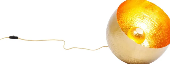 Diese Beschichtung leuchtet besonders intensiv, wenn die Lampe per Kippschalter angeschaltet wird. Die Außenseite der Stahllampe ist in Messing beschichtet. Die ungewöhnliche Tischlampe findet am besten auf einem großen Tisch Platz, sodass Raum genug ist, sich selbst hinzusetzen und zum Beispiel etwas zu arbeiten. Alternativ kann sie auf einem kleinen Beistelltisch platziert werden und strahlt von hier aus ihr wunderbares Licht ab. Die Leuchte selbst ist wechselbar und verbraucht nur 25 Watt. Die attraktive Lampe besitzt einen Durchmesser von 35 Zentimetern.“