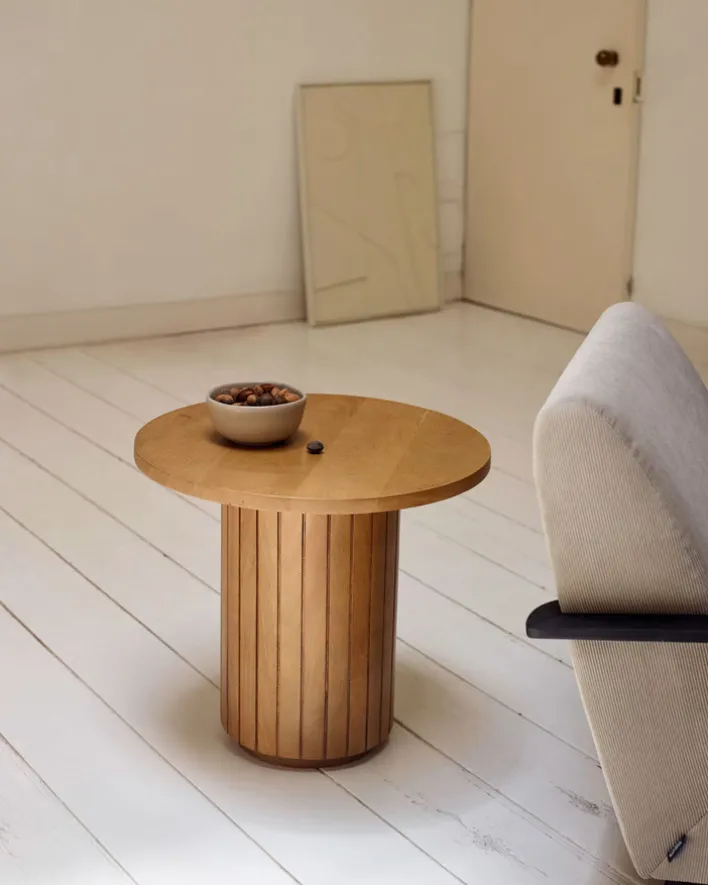 In Sachen Design ist der kleine Beistelltisch eine interessante Sache: Schlicht gehalten, passt er in jeden Einrichtungsstil. Das helle Holz ist hochmodern, die Optik mit der breiten Mittelsäule kann sowohl Vintage- und Retro-Stile als auch Industrial. Man mag sich diesen praktischen kleinen Tisch in der Sofalandschaft vorstellen oder neben einem Loungesessel, dezent im Wintergarten zwischen üppigen Pflanzen oder in einem Kreativ-Zentrum zwischen Sitzsäcken. Das natürliche Holz zeigt eine schöne Maserung, auf weitere Gestaltung wird verzichtet.