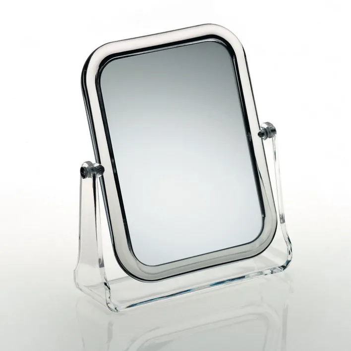 Der silberfarbige Rahmen und der transparente Fuß des Tischspiegels bestehen aus hochwertig verarbeitetem Acryl. Das strapazierfähige und robuste Material hat glatte Oberflächen. Die Vorrichtungen zum Schwenken des Spiegels sind ebenfalls aus Kunststoff gefertigt. Der in den stabilen Rahmen eingefasste Spiegel ist aus echtem Spiegelglas gefertigt.
