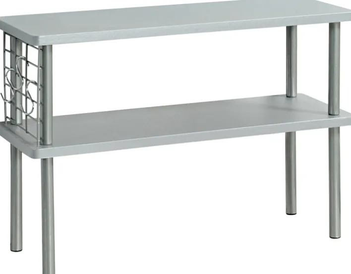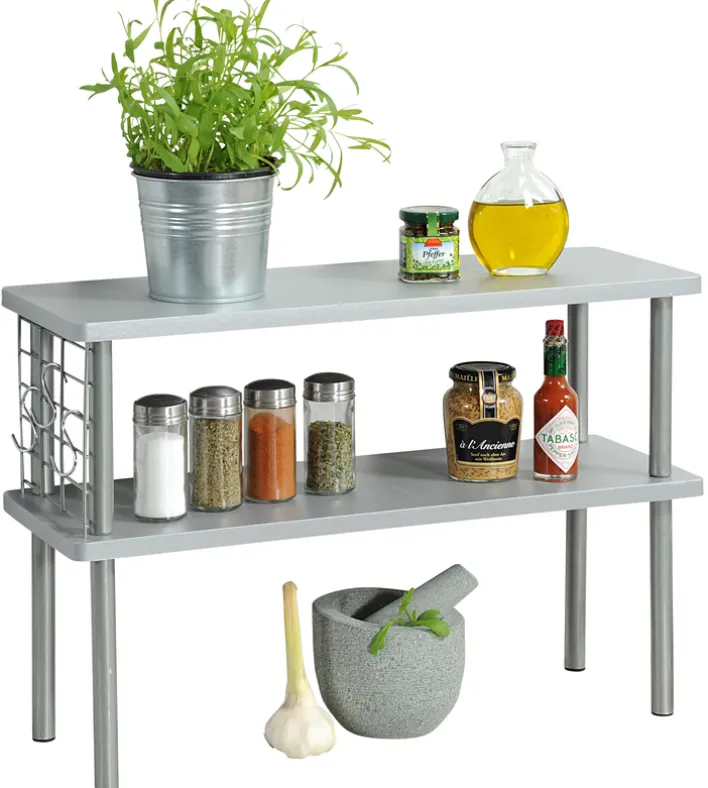 Das Regal von Kesper präsentiert sich in einem modernen, rechteckigen Design und ist ideal für verschiedene Wohnbereiche geeignet. Mit einer Breite von 20 cm, einer Höhe von 38 cm und einer Länge von 55 cm bietet es ausreichend Platz für Bücher, Dekorationsgegenstände oder andere Utensilien. Die Hauptfarbe Grau verleiht dem Regal eine zeitlose Eleganz, die sich nahtlos in unterschiedliche Einrichtungsstile einfügt. Gefertigt aus einer mitteldichten Faserplatte (MDF) mit einer lackierten Oberfläche, überzeugt das Regal durch seine robuste Holznachbildung. Die klaren Linien und die schlichte Formgebung werden durch die silbernen Metallbeine und die dekorativen Seitenelemente ergänzt, die dem Möbelstück eine besondere Note verleihen. Dieses Regal ist nicht nur funktional, sondern auch ein stilvolles Element für Ihr Zuhause.
