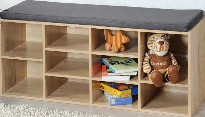 Der Schuhschrank verfügt über zehn offene Fächer, die ausreichend Platz für verschiedene Schuharten bieten. Die gepolsterte Sitzfläche in Grau sorgt für zusätzlichen Komfort beim An- und Ausziehen der Schuhe.
