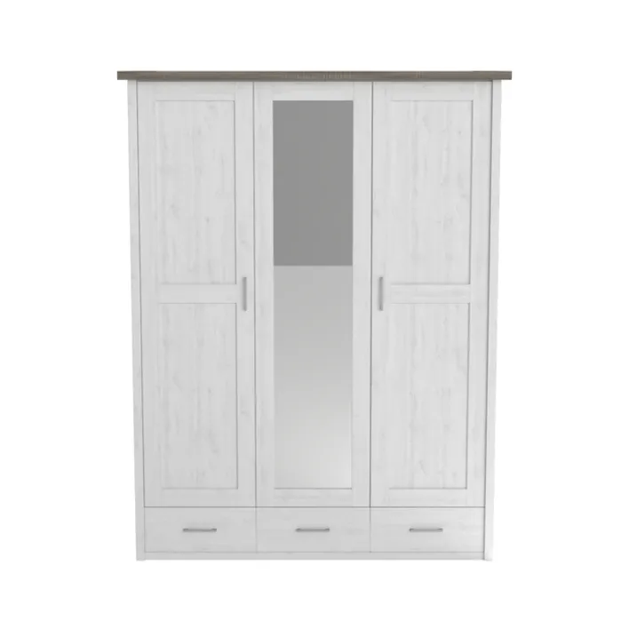 Der Kinder-Drehtürenschrank aus der Serie LUCA vereint Funktionalität und ansprechendes Design im Landhausstil. Mit einer Breite von 148 cm, einer Höhe von 201 cm und einer Tiefe von 62 cm bietet er großzügigen Stauraum. Der Schrank verfügt über drei Drehtüren, von denen eine mit einer Spiegelfront ausgestattet ist, was nicht nur praktisch ist, sondern auch den Raum optisch vergrößert. Die Hauptfarbe des Schranks ist Weiß mit einer Absetzung in Trüffel-Optik, die dem Möbelstück eine elegante Note verleiht.