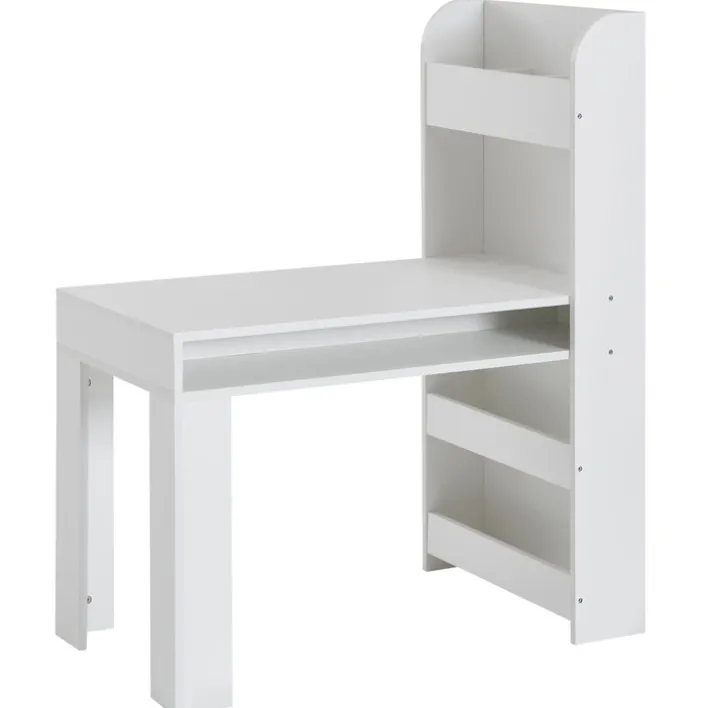 Der Kinder Schreibtisch mit Regal in Weiß hat eine Größe von 50 x 110 cm und bietet dem Nachwuchs ausreichend Platz für Hausaufgaben. Mit seinem schlichten Design ist er zudem vielseitig kombinierbar und sorgt für ein freundliches Ambiente.