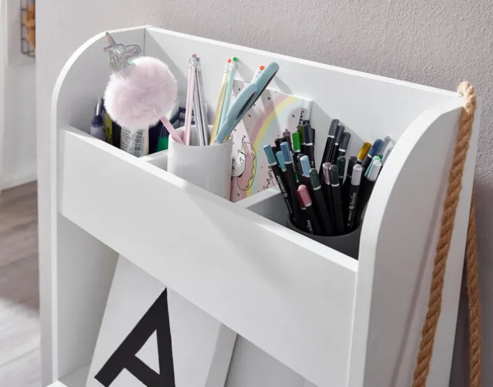 Der rechteckige Kinder Schreibtisch mit Regal hat Maße von 50 x 110 x 90 cm und besteht aus matt weißer Holznachbildung. Beschichtet mit Melaminharz ist er sehr strapazierfähig und lässt sich unkompliziert feucht abwischen. Unter der großen Tischplatte, die mit bis zu 30 kg belastbar ist, befindet sich eine große offene Ablage. Darüber hinaus ist der Schreibtisch mit einem offenen Regal für Bücher und Spielsachen ausgestattet.