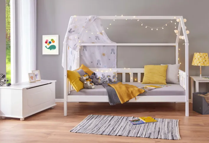 Dank der schlichten Farbgebung passt das Kinderbett RUDOLF ideal zu jedem Einrichtungsstil, egal ob farbenfroh oder dezent. Ein heimeliges Gefühl schenkt die Oberkonstruktion. Sie kann mit Decken in ein Dach verwandelt werden, sodass eine behagliche Höhle entsteht.