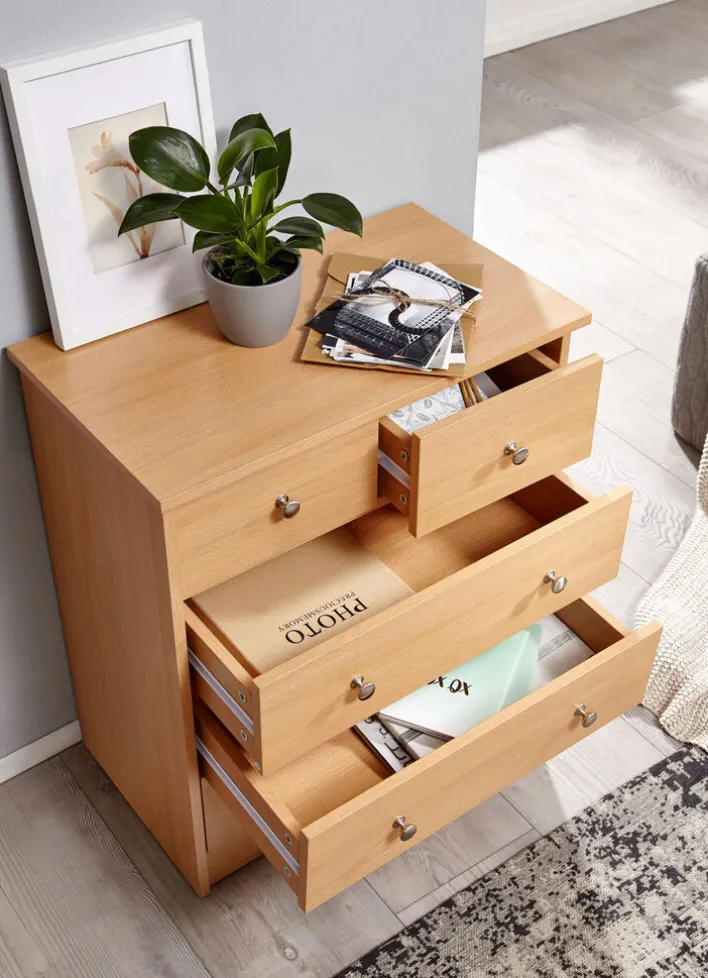 Die Kommode besteht aus buchefarbig folierter Holznachbildung und lässt sich mit maximal 30 kg belasten. Ihr klassisches Design perfektionieren die chromfarbigen Griffe. Noch wichtiger als die ansprechende Optik ist jedoch der umfassende Stauraum. In drei großen und zwei kleinen Schubkästen bietet das Möbelstück viel Platz für Wäsche und vieles mehr. Mit dem schlichten Aussehen und warmer Holzfarbe verleiht die Kommode dem Wohnraum zudem ein gemütliches Ambiente, in dem sich Familie und Gäste wohlfühlen.