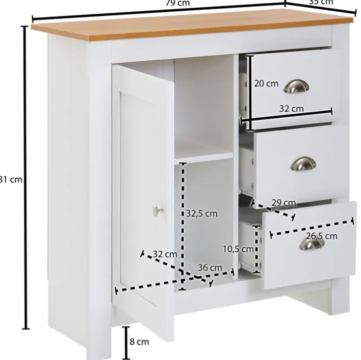 Die Kommode mit Schubkästen in den Farben Weiß/ Braun hat eine Größe von 79 x 81 cm. Sie überzeugt mit einem klassisch-eleganten Design und viel Stauraum und ist eine Bereicherung für viele Wohnräume.