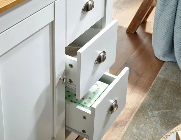 Die Kommode besteht aus solider Holznachbildung in Weiß und zieht dank braun abgesetzter Oberplatte und antik wirkenden Griffen alle Blicke auf sich. Beschichtet mit Melaminharz, sind die Oberflächen für die tägliche Beanspruchung ausgerichtet. Doch nicht nur in Sachen Qualität und Optik überzeugt die Kommode. In drei Schubkästen sowie hinter einer Drehtür bietet sie zudem jede Menge Stauraum. Für ein harmonisches Ambiente empfiehlt es sich, die Kommode mit weiteren Möbelstücken der Serie zu kombinieren.