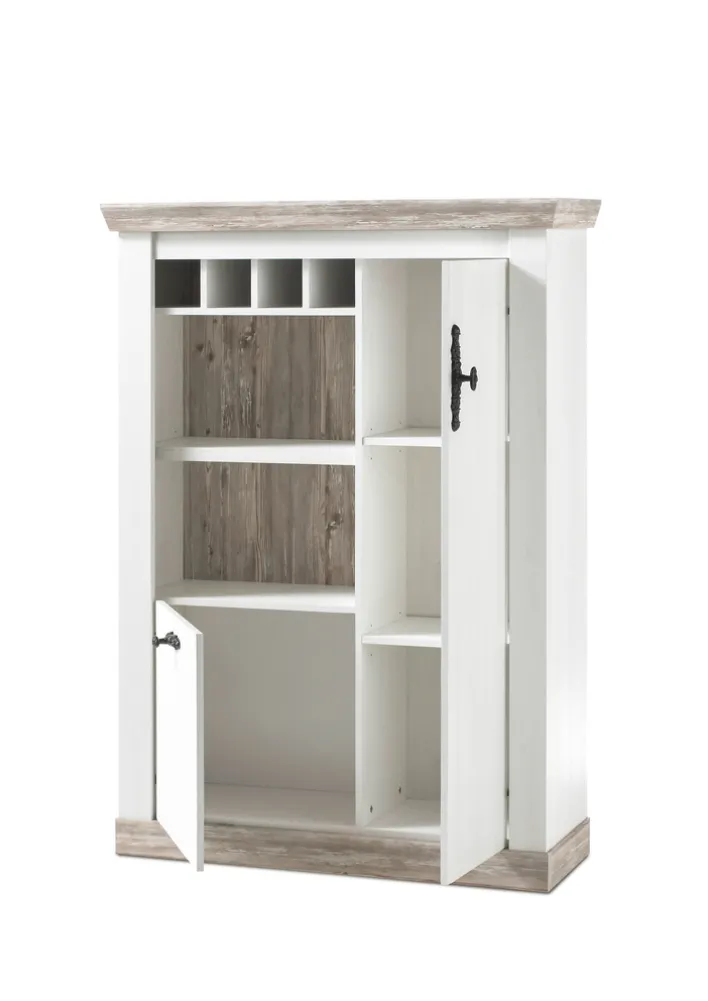 Optisches Highlight der Kommode FLORENZ sind ihre im Pinie-Oslo-Dekor gestalteten Knopfgriffe sowie die helle Holznachbildung zum ansonsten weißen Korpus. Zur Ausstattung gehören vier kleine und zwei große, offene Fächer. Ihr Stauraum wird ergänzt von drei Einlegeböden hinter den Drehtüren. Die Beschichtung des Modells ist robust gegen Kratzer und Schläge sowie glatt und dadurch äußerst pflegeleicht. Mit den verschnörkelten Metallplatten der Griffe entsteht ein beinahe antiker Eindruck. Damit fügt sich die Kommode gut in Einrichtungen des Landhausstils ein.