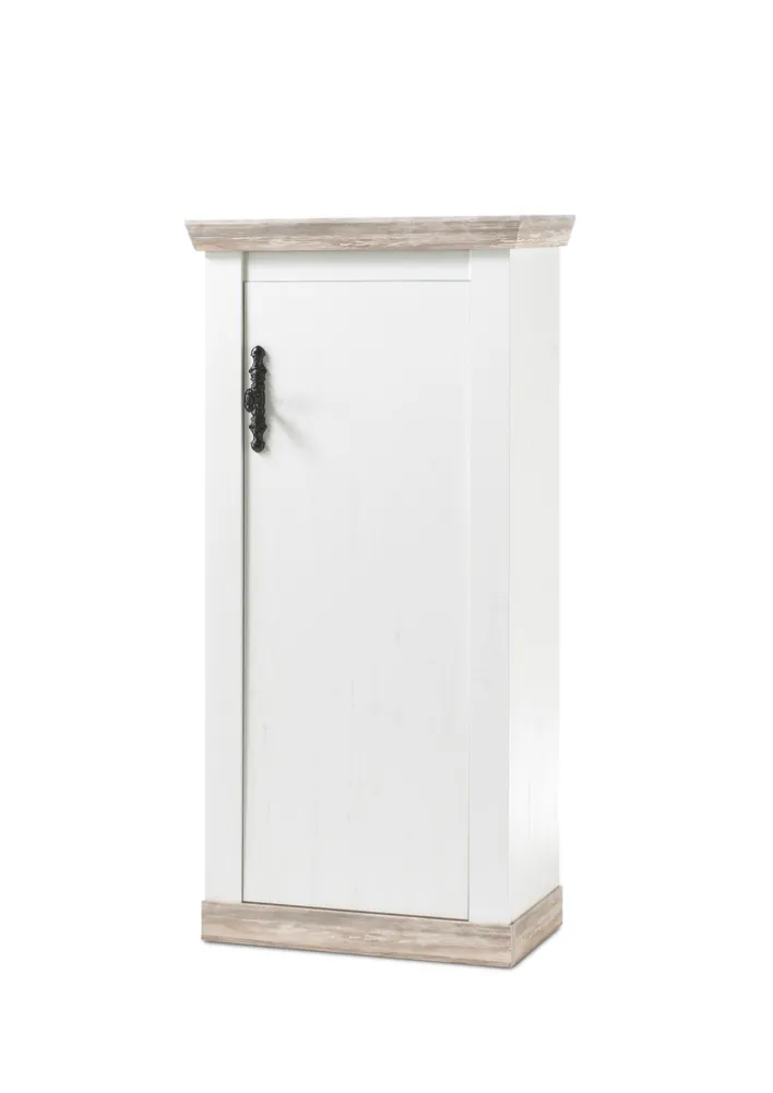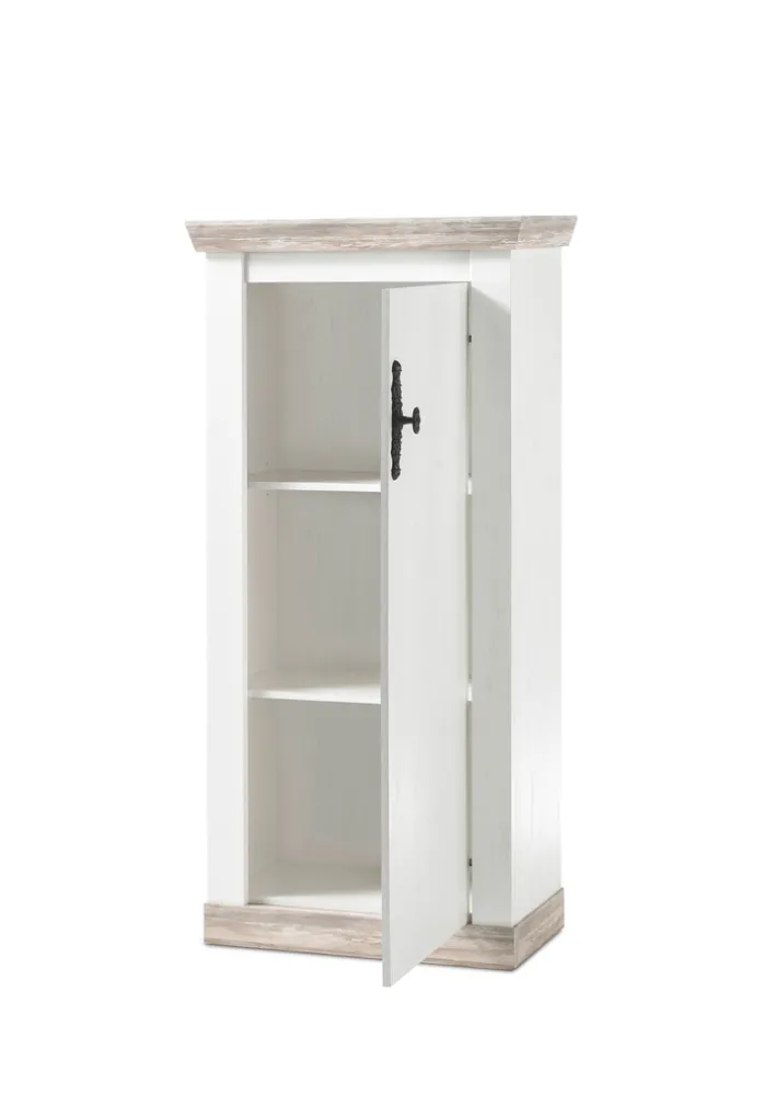 Die FLORENZ Kommode bringt auf 71 x 146 cm in Weiß/Braun gehalten typisch italienisches Flair in Wohnräume. Außerdem ist sie ein kleines Stauraumwunder, hinter der großen Drehtür verbirgt sich ein Innenraum mit zwei getrennten Fächern – ideal um kleinere wie größere Sachen des Haushalts zu verstauen.