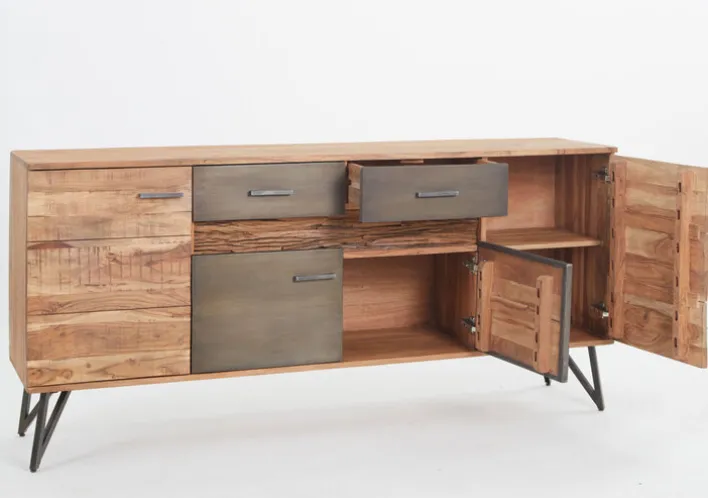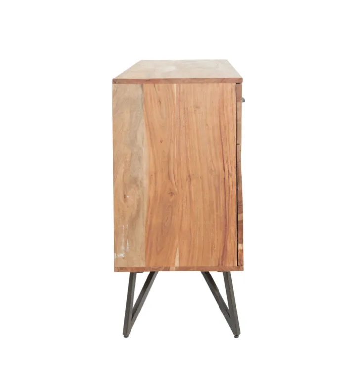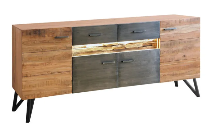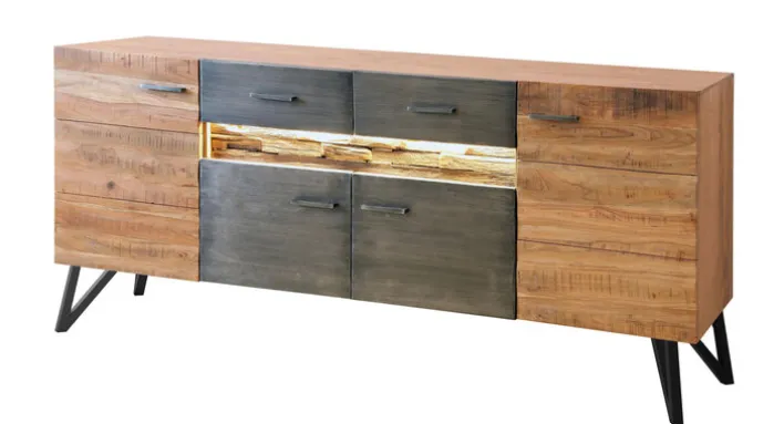 Die Kommode besteht aus massivem Akazienholz in Braun und Schwarz und kombiniert diese mit robusten Füßen aus schwarzem Eisen. Mit einer Größe von 175 x 80 x 40 cm bietet das Sideboard viel Stauraum für Gläser, Geschirr und vieles mehr. Hinter vier Drehtüren und in zwei Schubkästen sind die Alltagsgegenstände blick- und staubgeschützt verwahrt und Wohn- oder Esszimmer sehen stets aufgeräumt aus. Für ein optisches Highlight sorgt die extravagant platzierte LED Beleuchtung unter den Schubkästen, die den rustikalen Holzeinsatz gekonnt akzentuiert.