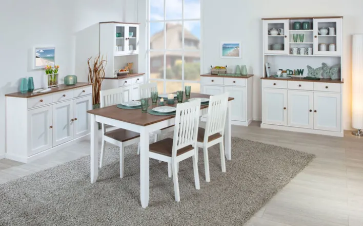 Die formschöne Kommode verfügt über zwei Drehtüren. Über diesen beiden Türen sind zwei Schubkästen arrangiert. Insgesamt überzeugt das Modell im Esszimmer mit viel Stauraum. Während die Fronten und der Korpus weiß strahlen, sorgen die vier runden Knöpfe an Schubkästen und Türen sowie die obere Ablagefläche in Braun für einen angenehmen farblichen Kontrast. Das Modell hat ein Eigengewicht von 31,4 Kilogramm.