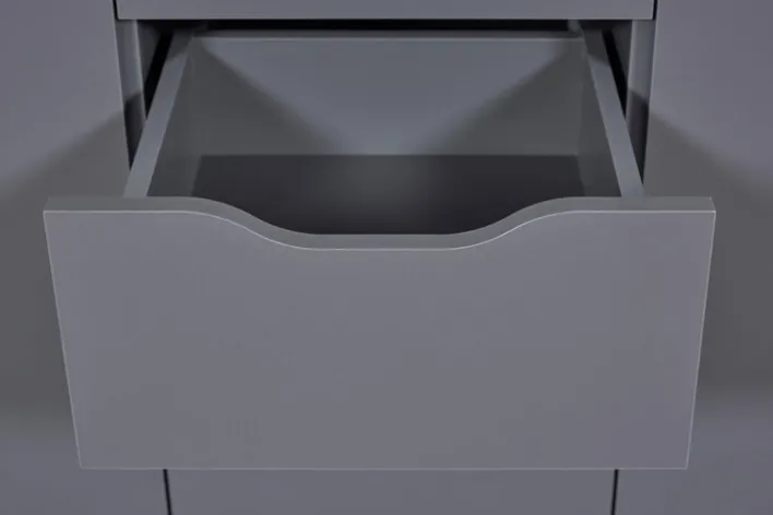 Die Kommode LION ist aus graphitgrauer Holznachbildung gefertigt. Ihre dekorativen Grifföffnungen verleihen der Front eine wohnliche und harmonische Atmosphäre. Die Kommode ist Teil einer umfangreichen Serie von Aufbewahrungsmöbeln gleichen Namens. Sie kann mit diversen Elementen in verschiedenen Größen und Formen kombiniert werden.