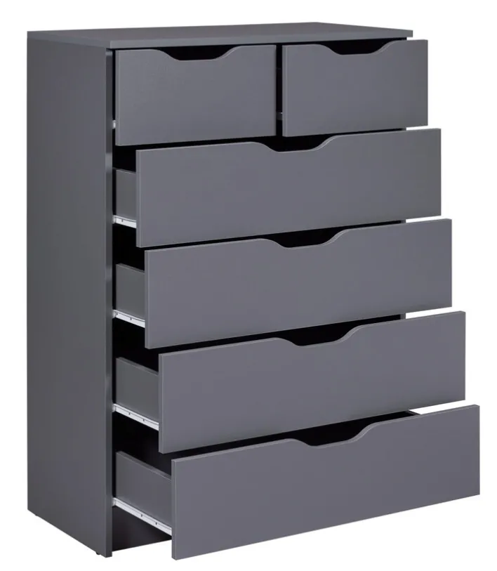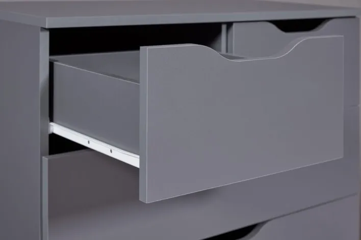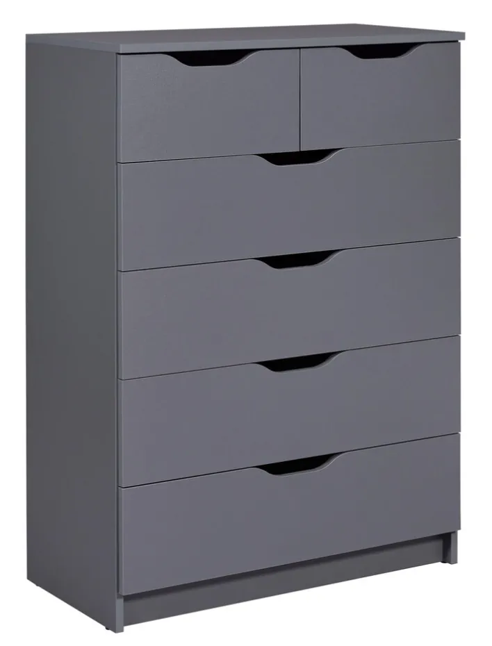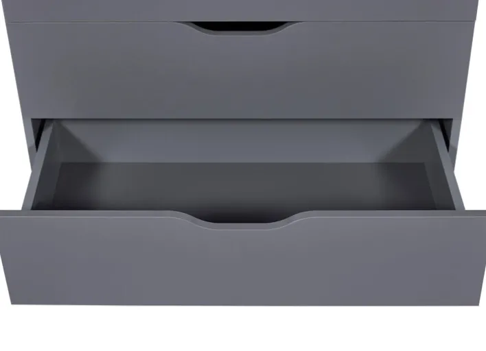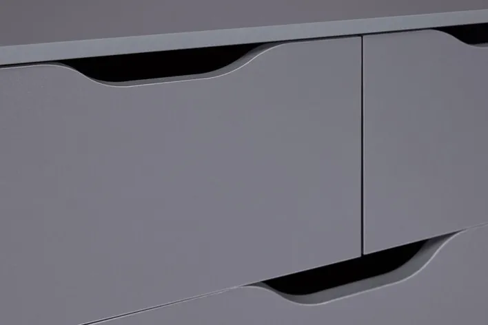 Die funktionale Kommode LION im Farbton graphitgrau ist eine Bereicherung für modern eingerichtete Wohnbereiche und bringt viel Stauraum mit. Durch das frische und freundliche Design mit grifflosen Fronten ist die Schubladenkommode ein Blickfang für Wohn- und Schlafzimmer. Auch für das Kinderzimmer ist sie ideal. Vier große und zwei kleine Schubkästen mit Griffmulden bieten Platz für verschiedene Wohnaccessoires, Wäsche, Spielzeug und Kleinteile. Die Kommode verleiht Einrichtungen einen besonderen Charme.