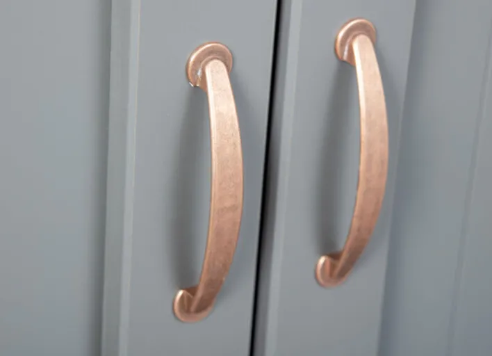 Die Kommode NICLAS 3.1 ist 90 cm breit, 86 cm hoch und 45 cm tief. Sie ist aus Massivholz in Grau. Kupferfarbene Griffe, 2 Drehtüren und 2 Schubkästen gehören zur Ausstattung.