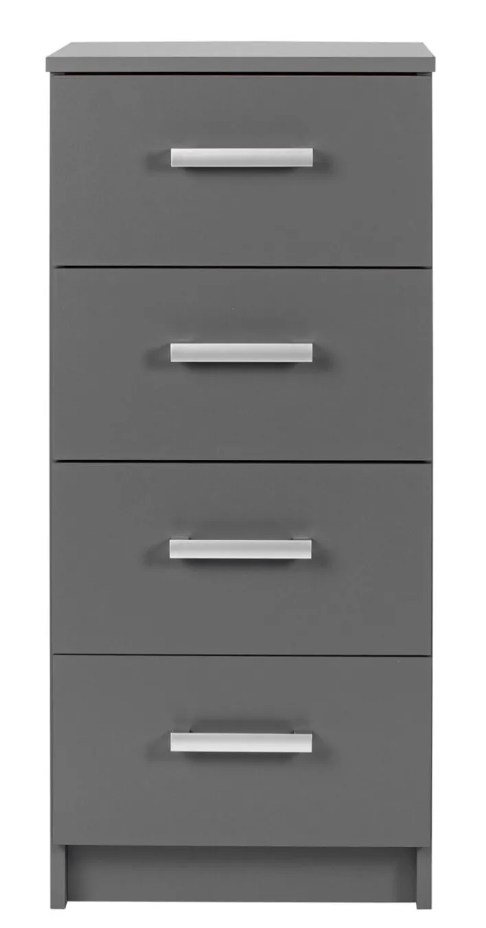 Die ROBERT 4 ist in einem attraktiven Mittelgrau gehalten. Sie passt hervorragend in modern eingerichtete Wohnungen. Vor allem im Arbeitszimmer ist die Kommode ein echter Allrounder. Stifte, Büroutensilien, Tablets und Papier verschwinden in den leichtgängigen Schubkästen mit großen silberfarbenen Griffen und das Arbeitszimmer sieht immer ordentlich du aufgeräumt aus. Aber auch im Flur, in Hobbyraum oder im Kinderzimmer überzeugt das Platzsparwunder in Optik und Funktion.