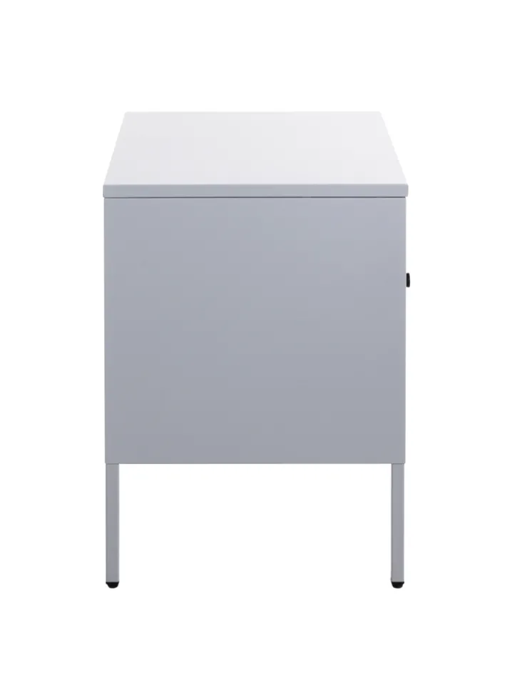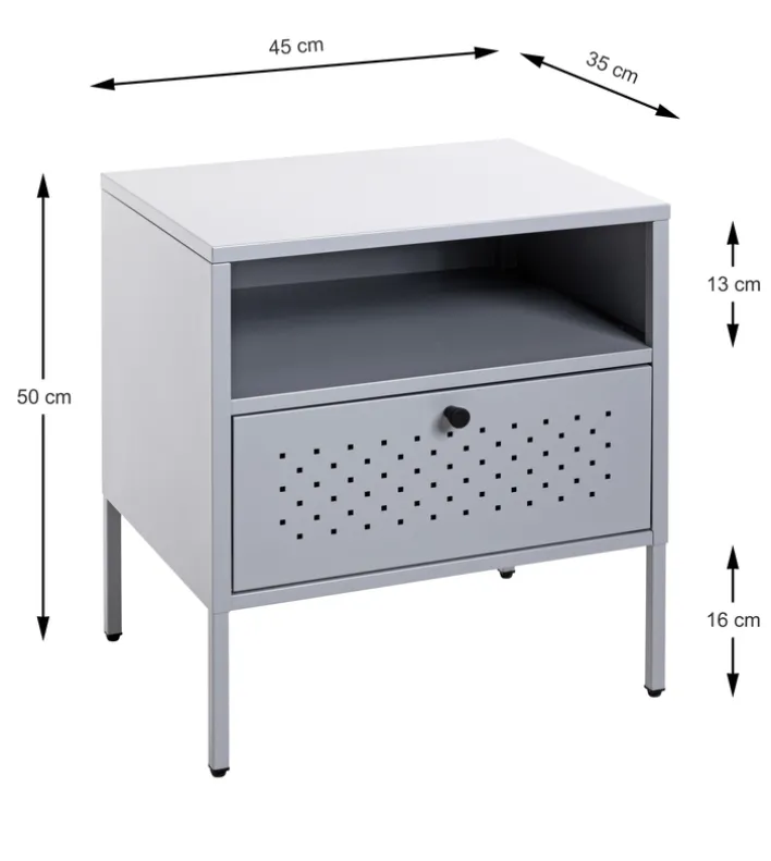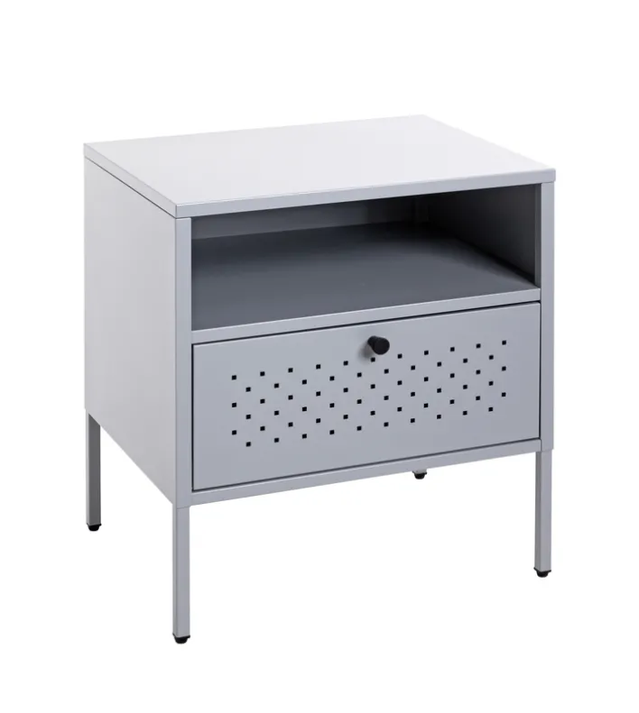 Die formschöne Konsole im Farbton Silbergrau hat ein zeitloses Design und wertet den modern eingerichteten Schlafbereich auf. Neben einem Polster- oder Boxspringbett kommt die Konsole mit den Maßen 45 x 50 cm gut zur Geltung. Die Oberplatte und ein offenes Fach bieten Platz für eine Nachttischlampe, die Bettlektüre und eine Brille. Private Accessoires sind blickdicht hinter einer Drehtür untergebracht. Die Konsole hat einen industriellen Charme und schafft ein wohnliches Ambiente.