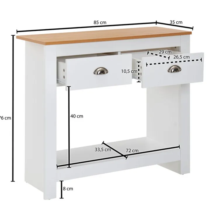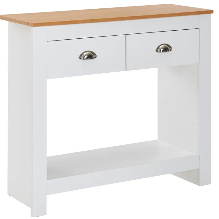 Der hochwertige Konsolentisch aus Eiche präsentiert sich elegant in den Farben Weiß und Braun. Durch das zeitlose Design ist der Tisch mit den Maßen 85 x 76 cm praktisch und stilvoll zugleich. Der Tisch ist vielseitig verwendbar und macht in Wohnzimmern oder Esszimmern eine gute Figur. Auch im Eingangsbereich rundet er die Einrichtung ab. Die Ablage und zwei Schubladen bieten Platz für verschiedene Accessoires. Die Oberplatte lässt Raum für verschiedene Dekorationsideen. Der Konsolentisch schafft ein wohnliches Ambiente.