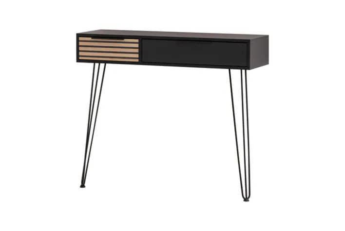 Der Konsolentisch besticht durch sein modernes Design und die Kombination aus schwarzen und braunen Farbtönen. Die Maße des Tisches betragen 103,7 cm in der Breite, 88,4 cm in der Höhe und 32,05 cm in der Tiefe, bei einem Gewicht von 20,5 kg. Der Tisch verfügt über zwei Schubkästen, die praktischen Stauraum bieten. Eine der Schubladen ist mit einem auffälligen Streifenmuster in Holzoptik gestaltet, das einen interessanten Kontrast zur schwarzen Oberfläche bildet.