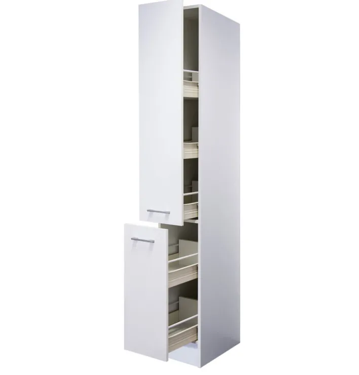 Der Küchen Apothekerschrank LUCCA mit den Maßen 30 x 200 x 57 cm wird in Deutschland aus solider Holznachbildung gefertigt und erstrahlt zur Gänze in mattem Weiß. Er ist mit zwei Auszügen ausgestattet, die insgesamt fünf Ablagefächer bieten. Damit Getränke, Öl- und Essigflaschen sowie haltbare Lebensmittel beim Öffnen und Schließen nicht von den Ablagefächern rutschen können, sind diese mit einer halbhohen Rückwand und seitlichen Haltestangen versehen.