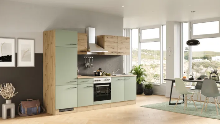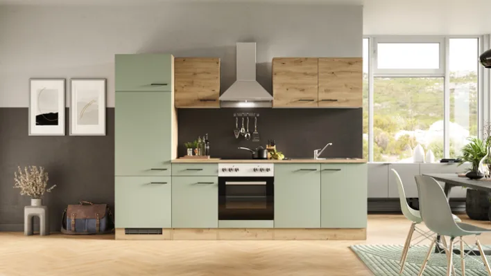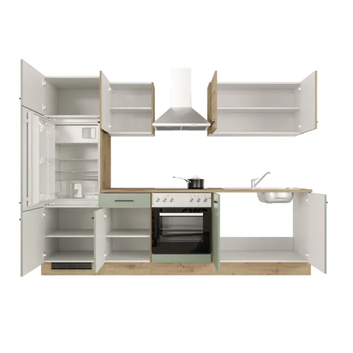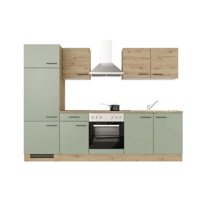 Die Küchenzeile CARA bietet eine harmonische Kombination aus Funktionalität und modernem Design. Die Fronten in einem sanften Grünton verleihen der Küche eine frische und einladende Atmosphäre, während die Oberflächen in Holzdekor für eine warme und natürliche Optik sorgen. Die Griffe sind inklusive und fügen sich nahtlos in das Gesamtbild ein. Die Küche besteht aus einer Holznachbildung mit einer folierten Oberflächenbeschichtung, die Langlebigkeit und einfache Pflege gewährleistet.