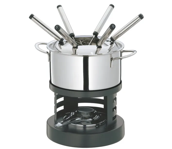 Gefertigt ist das Fondue Set LUZERN von KÜCHENPROFI aus Edelstahl und schwarz lackiertem Metall. Der Fondue-Topf ist mit einem praktischen Spritzschutz ausgestattet und hat ein Fassungsvermögen von 1,6 Litern. Er verfügt außerdem über einen Sandwichboden und ist für alle Herdarten, auch für solche mit Induktionskochplatte, geeignet. Die Fonduegabeln sind mit unterschiedlichen Markierungen versehen, damit es zu keiner Verwechslung kommt. Das KÜCHENPROFI Fondue Set LUZERN eignet sich optimal für einen geselligen Abend in einer netten Runde.