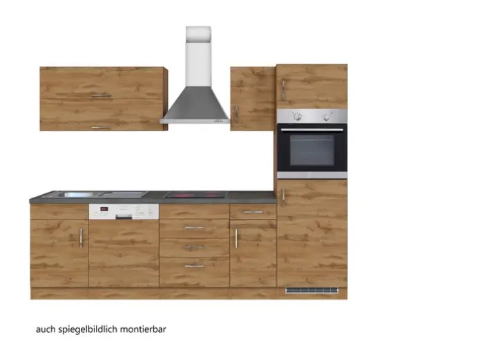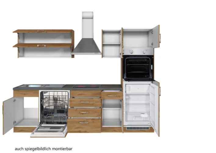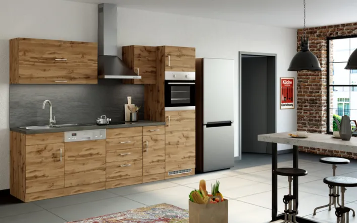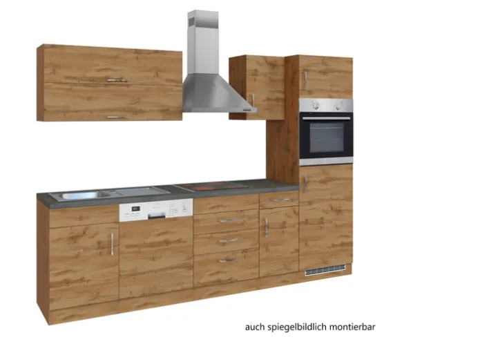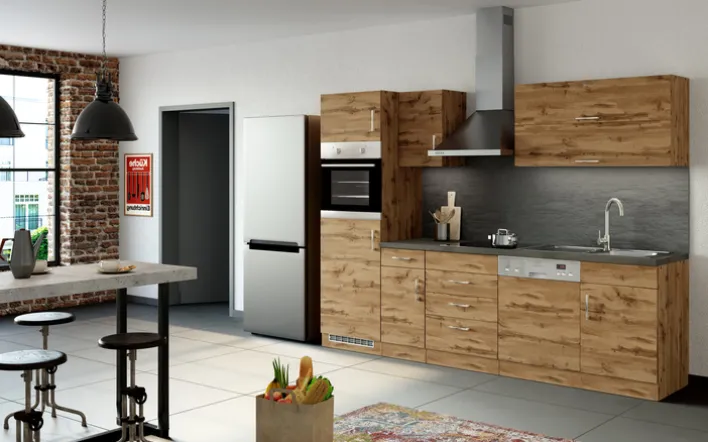 Freunde eines natürlichen Einrichtungsstils werden von dieser Küche begeistert sein. Die trendige Holzfarbe wird durch die Metallflächen der Einbaugeräte kontrastiert, die bereits in die Zeile integriert sind. Dunstesse, Backofen und Geschirrspüler entsprechen modernen Standards. Die Qualität der Verarbeitung überzeugt ebenfalls, denn die ODENSE ist Made in Germany. Leicht gängige Schubladen und eine zweckmäßige Inneneinteilung sind für ODENSE eine Selbstverständlichkeit. Hier macht Kochen richtig Spaß! Die Lieferung der Küchenzeile erfolgt zerlegt.