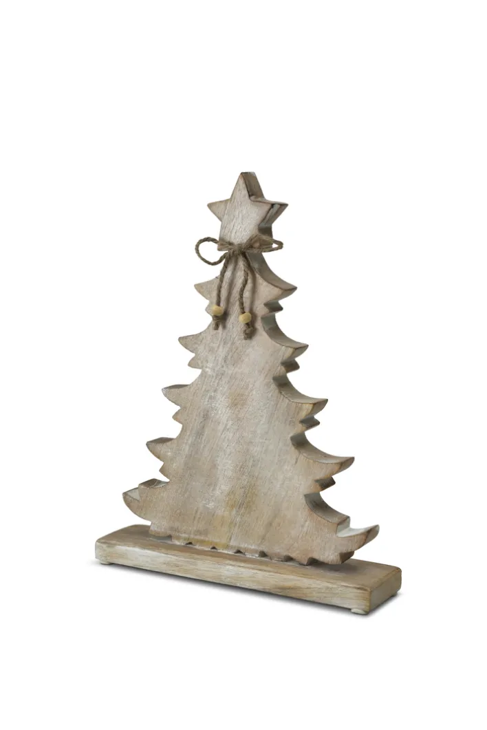 Die Baumform ist stilisiert und klar konturiert, mit einer Sternform an der Spitze, die durch eine naturfarbene Kordel mit zwei kleinen Holzperlen zusätzlich betont wird. Das Design verzichtet auf zusätzliche Verzierungen und setzt auf den natürlichen Charakter des Materials. Die Standfläche sorgt für Stabilität auf ebenen Flächen. Die Kombination aus schlichter Form und natürlichen Materialien unterstreicht eine zurückhaltende, zeitlose Ausstrahlung.