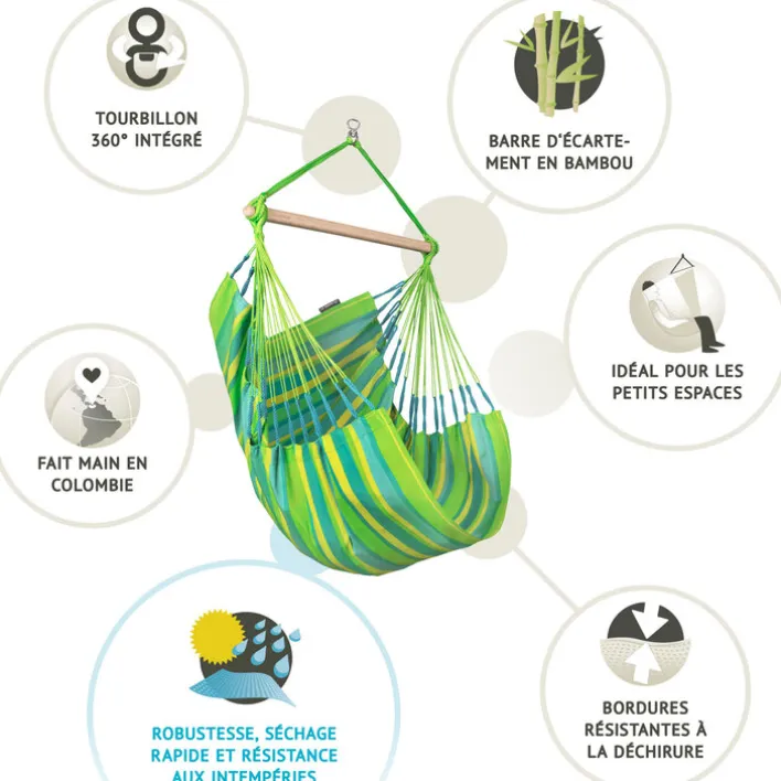 Der Hängesessel „Basic DOMINGO“ von La Siesta vereint Komfort und Stil in einem wetterfesten Design. Mit einer Breite von 105 cm und einer Länge von 140 cm bietet er ausreichend Platz für eine Person und hält bis zu 130 kg aus. Der Sessel ist aus hochwertigen Materialien gefertigt, darunter massives Bambusholz und Edelstahl, die für Stabilität und Langlebigkeit sorgen. Das Outdoorgewebe aus 100 % Polypropylen ist strapazierfähig und pflegeleicht, ideal für den Einsatz im Freien.