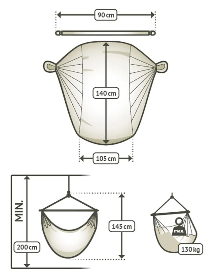 Breite: 105 cmHöhe: 145 cmTiefe/Ausladung: 140 cmLänge: 140 cmGewicht: 1,40 kgFlächengewicht /Grammatur: 180 g/m2Stellmaß: Benötigte Mindesthöhe: 200 cm / Gesamthöhe: 145 cm / Stablänge: 90 cmBreite Liegefläche: 105Länge Liegefläche: 140geeignet für Personen: 1 PersonenSitzbreite: 105 cmSitztiefe: 140 cmmaximale Belastbarkeit: 130 kg