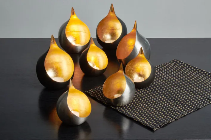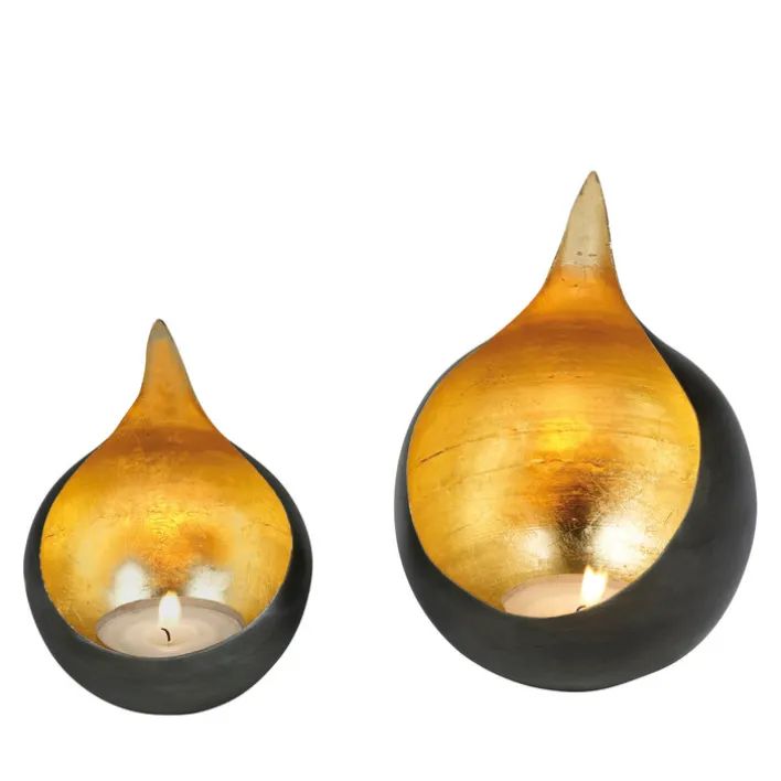 Das edle LAMBERT Windlicht CALDERA in schöner Tropfenform besteht aus hochwertigem Eisen und ist handgetrieben. Im Inneren ist das Windlicht nach alter Vergoldungstechnik mit feinem Metallblatt in Gold belegt, während das Äußere in Schwarz patiniert ist. Das goldene Metallblatt verleiht dem Kerzenlicht ein wunderschönes Schimmern. Einem romantischen Sommerabend steht somit nichts mehr im Weg. Wind und Wetter sollte das Windlicht allerdings nicht ausgesetzt werden, da diese die goldfarbige Fläche in Mitleidenschaft ziehen könnten.