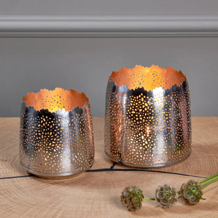 Das LAMBERT Windlicht SONAM hat eine Höhe von 12,5 cm und einen Durchmesser von 12,5 cm. Das ungewöhnliche Design mit dem Lochmuster und dem unregelmäßigen Rand macht es zu einem wunderschönen Blickfang in jedem Raum.