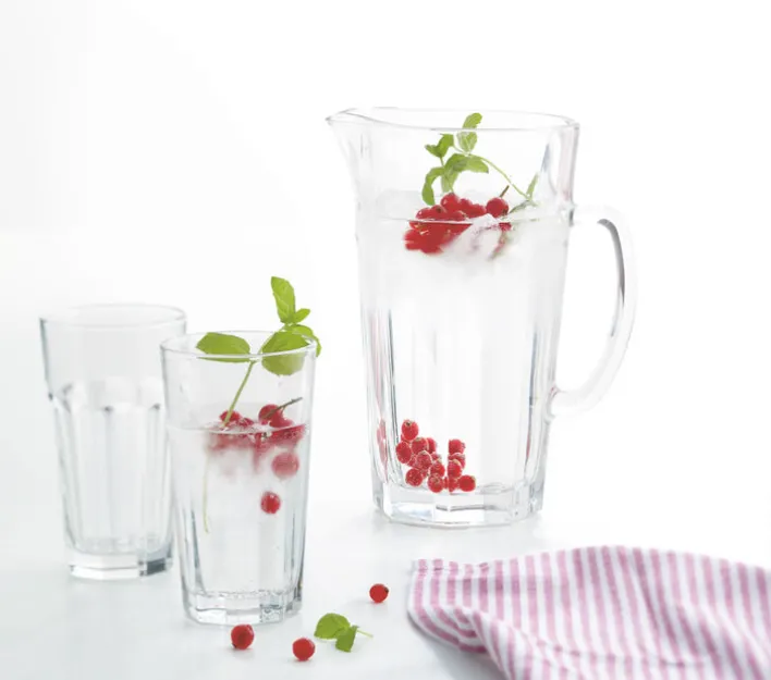 Dieser Krug der Serie ROCK mit dem klassischen Talleyrand ist so schön praktisch, um Eistee, gekühlte Säfte oder Wasser zu servieren. Die Glas-Serie ROCK hat eine achteckige bzw. polygonale Grundform und kann dadurch wunderbar in Ihrer Hand gehalten werden. Vom Fuß verlaufende breite Kerben schwingen sich nach außen in den glatten Rand. Dieses traditionelle Tallyrand Design ist sehr beliebt, denn der klassische Stil ist zeitlos und immer modern.