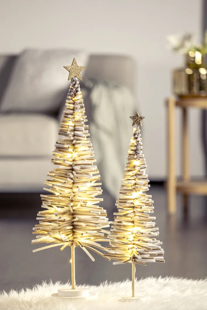 Die LED-Beleuchtung der modernen Tanne aus Filz und Kunststoff funktioniert mit drei Batterien der Sorte AAA. Das für den Dauerbetrieb geeignete Modell verfügt über einen praktischen Timer. Die nur 190 Gramm leichte Weihnachtsdekoration steht sicher auf ebenen Flächen wie einem Glastisch. Das Modell überzeugt sowohl einzeln als auch in der Gruppe, wenn es als Teil eines kleinen Winterwaldes arrangiert ist.