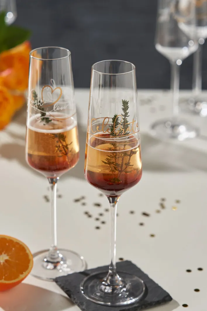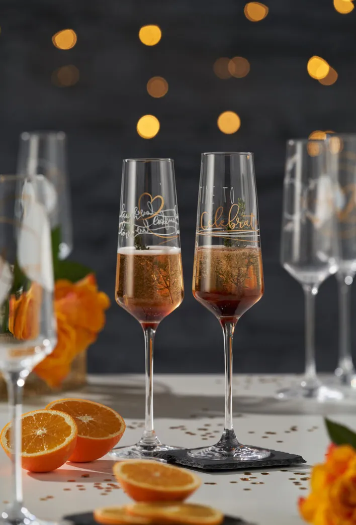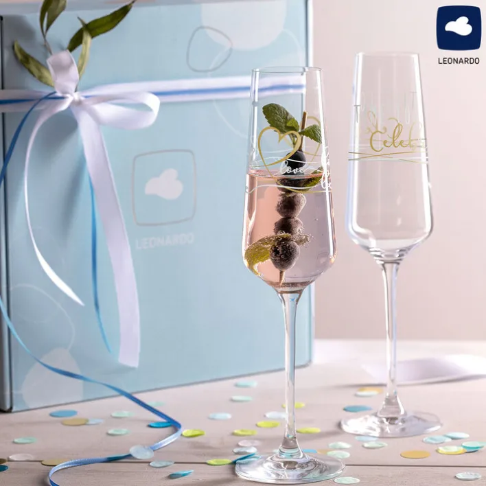 Stilgerecht auf Weihnachten anstoßen lässt sich mit dem 2er Set Sektgläser PRESENTE CELEBRATE. Das hochwertige Kristallglas aus dem Hause LEONARDO ist mit eleganten goldenen Schriftzügen versehen. Besonders originell: Die zwei Sektgläser sind unterschiedlich verziert. Da muss man doch gleich mal nachsehen, was bei dem charmanten Gegenüber geschrieben steht…