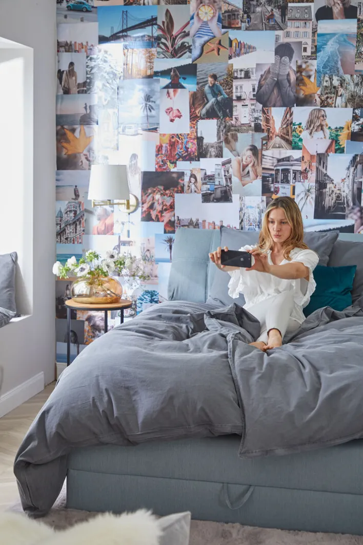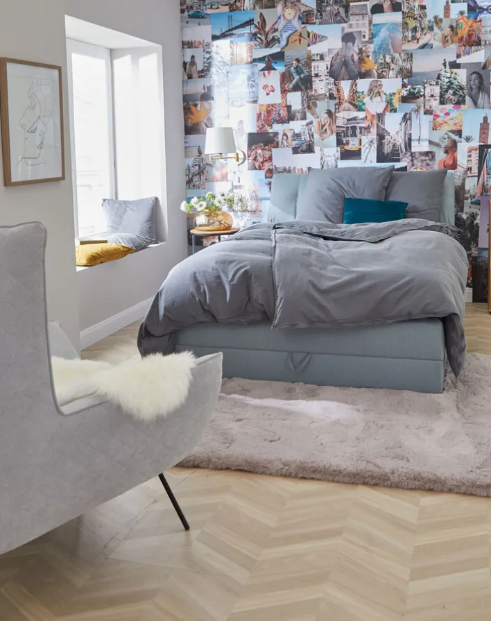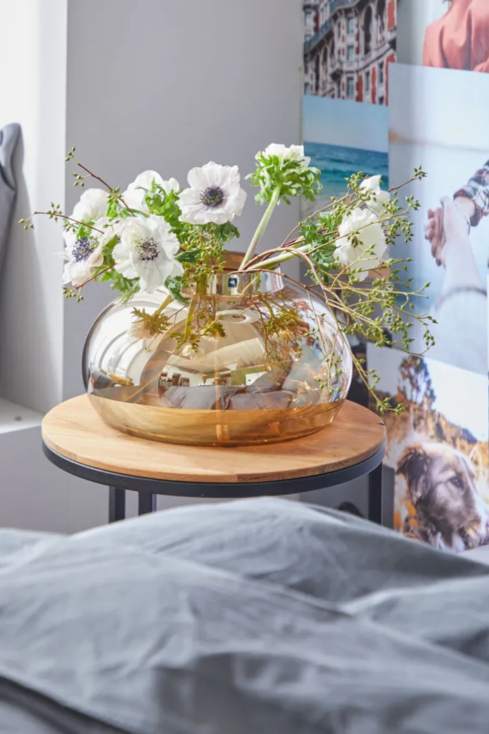 Die Vase besteht aus Farbglas und ist 9,3 cm hoch. Sie besitzt einen kräftigen unteren Teil, einen breiten Bauch, der sich nach oben stark verjüngt. Diese Öffnung ist rund und nicht sehr hoch, sodass die Blumen durchaus schräg stehen können. Sie haben in dem großen unteren Raum genügend Platz für ihre Stängel. Weiterhin überziehen zarte und dünne Strukturelemente das Gefäß. Auf diese Weise wirkt die ganze Vase filigran und leicht. Sie sieht edel aus und kann auch gut leer als Dekoration aufgestellt werden. #porta #portamoebel #warmhome #meinporta #portamöbel #fernweh