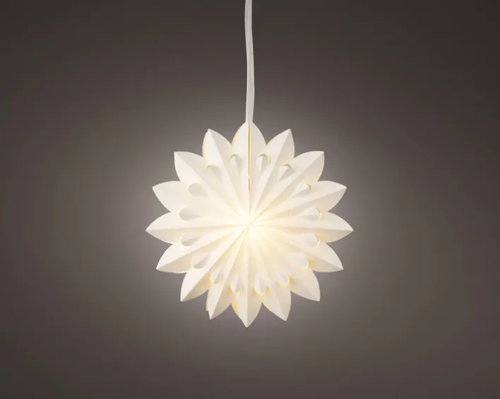 Dieser klassisch weiße LED-Stern aus Papier ist 15 cm hoch und hat einen Durchmesser von 60 cm. Er kann sowohl liegend als auch – mit etwas Kreativität – hängend verwendet werden und trägt als indirekte Beleuchtung zu einem weihnachtlichen sowie buchstäblich erhellenden Ambiente im Raum bei.