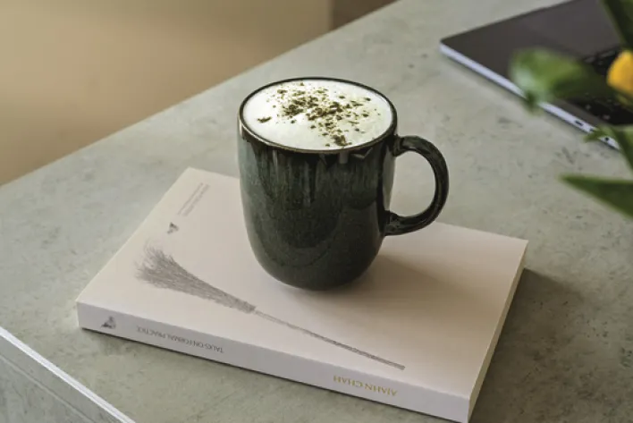 Die Oberfläche des Bechers zeigt eine sanfte, grünliche Textur, die durch einen natürlichen Farbverlauf besticht. Diese Optik verleiht jedem Stück einen einzigartigen Charakter. Der Becher ist mikrowellengeeignet, was ihn besonders praktisch für den täglichen Gebrauch macht.