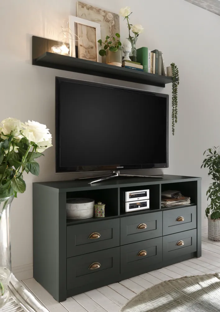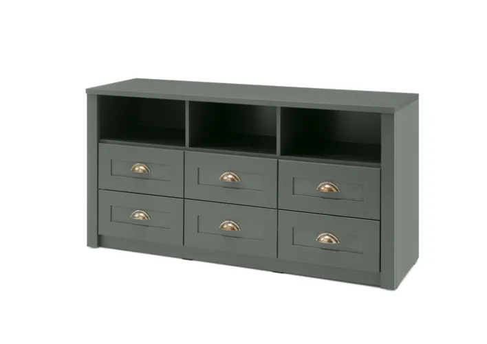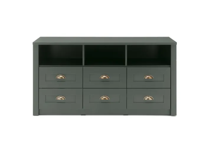 Das Lowboard ASCOT misst in Breite, Höhe und Tiefe 130 x 67 x 43 cm. Es ist in Grün mit goldfarbigen Bestandteilen gehalten. Zudem verfügt es über 6 Schubkästen und 3 offene Fächer. Es handelt sich um eine Holznachbildung in Grün.