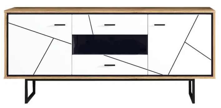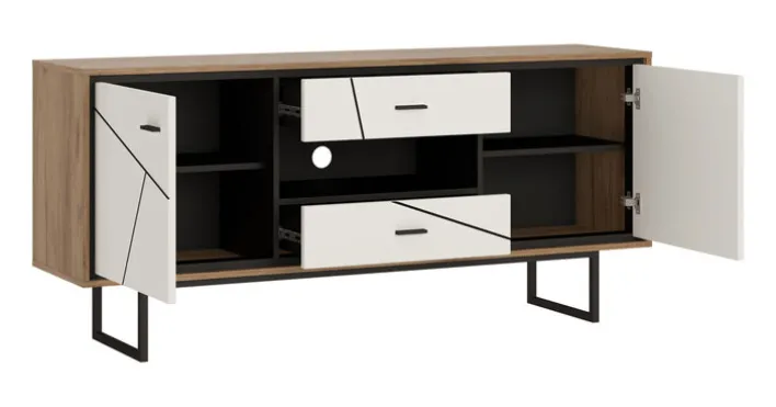 Das Lowboard BROLO im Format 167 x 74 cm ist modernes Kunstwerk und praktisches Möbelstück in einem. Mit seinen zackigen Diagonalen bringt es Schwung und Lebensfreude in Wohn- und Jugendzimmer, Eingangsbereiche und Büros. Die Kombination von warmer Holznachbildung und Fronten in kontrastierendem Schwarz und Weiß wirkt dabei besonders schick.