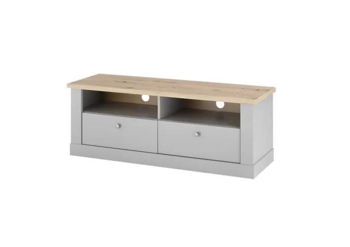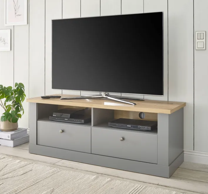Das Lowboard aus der Einrichtungsreihe CHAMBORD ist ein 132 cm langer Unterschrank von 48 cm Höhe mit zwei offenen Fächern sowie Aufbewahrungsmöglichkeit in zwei darunter befindlichen Schubladen, jeweils mit silberfarbigem Metallknauf. Die Deckplatte aus braunem Eichendekor schließt den hellgrau gehaltenen, massiven Korpus oben ab und ist bestens geeignet für Groß-TVs und Soundbars sowie weitere Elektronikgeräte, die durch vorbereitete Kabeldurchlässe an der Rückwand bequem angeschlossen werden können.