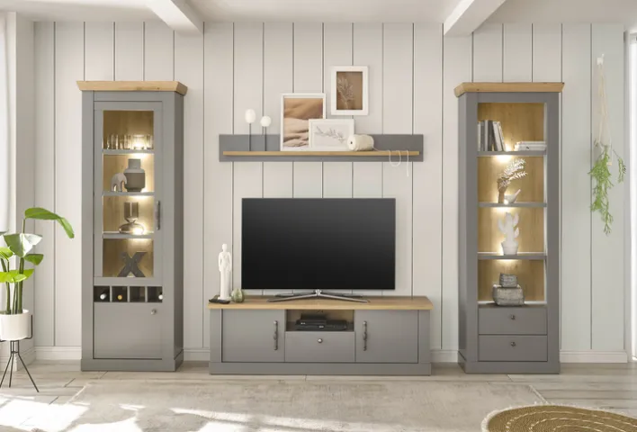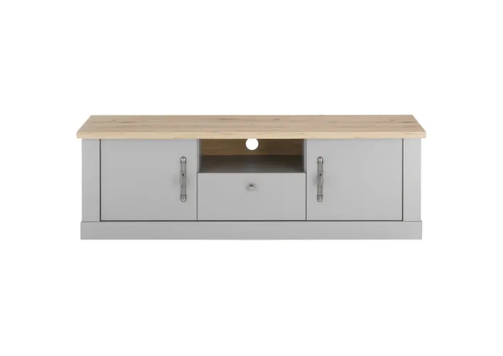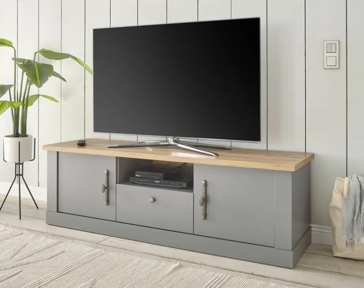 Das Lowboard CHAMBORD hat eine Platte in Eichen-Optik. Die Vorder- und Außenseiten sind in Grau gehalten. Der Korpus ist aus einer Holznachbildung gefertigt. Der verwendete Holzwerkstoff ist nach FSC zertifiziert. Das Gesamtgewicht des Möbelstücks beträgt 40,5 kg. Es stehen 2 Drehtüren und ein Schubkasten zur Verfügung. Dahinter befindet sich ein großzügiger Stauraum. Hohe Griffe vereinfachen das Öffnen und Schließen. Das offene Fach über der Schublade bietet Spielkonsolen, Streaming-Boxen und anderen TV-Utensilien Platz.