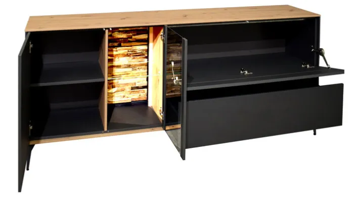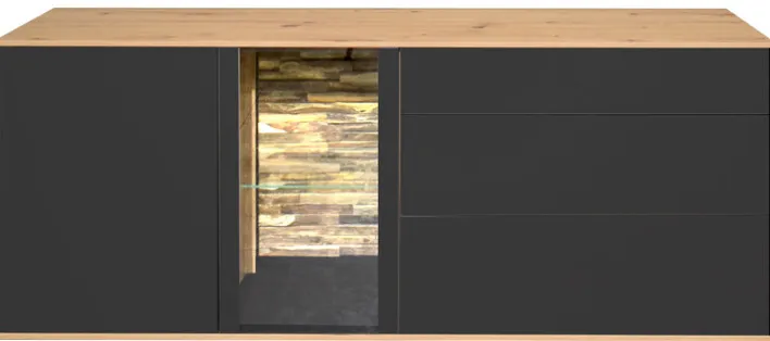 Das hochwertig verarbeitete Lowboard COMO präsentiert sich elegant mit Oberflächen in einem anthrazitfarbigem Mattlack und einem Asteiche Dekor. Durch das zeitlose Design und die elegante Gestaltung bietet das Lowboard mit LED-Beleuchtung und Push-To-Open Türen zahlreiche Kombinationsmöglichkeiten. Die Glastür-Rückwand mit Holzapplikation macht das Board zum Blickfang. Hinter einer Klappe, einer Drehtür und in einem Schubkasten stehen viel Platz und Stauraum zur Verfügung. Das Lowboard schafft ein wohnliches Ambiente im modern eingerichteten Wohnzimmer.