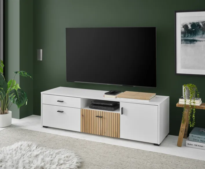 Optisch auffällig und zeitlos elegant ist das Lowboard HUDSON in den Farben Weiß und Braun mit den Maßen 150 x 44 cm. Das helle Lowboard aus stabiler Holznachbildung bietet ausreichend Stauraum und elegante Oberflächen mit dem ganz besonderen Extra.