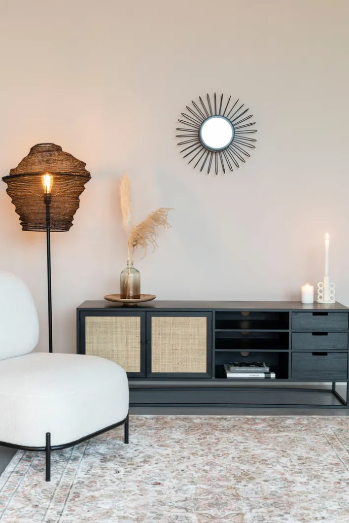 Das stylische Highboard JOANNA kombiniert ein schwarz pulverbeschichtetes Metallgestell mit schwarz lackierter Holznachbildung und natürlichem Rattangeflecht. Es hat eine Größe von 80 x 100 x 38 cm und lässt sich auch sowohl in Esszimmer als auch in offene Wohn-Essbereiche integrieren. Hinter den zwei Drehtüren mit Magnetverschluss bietet das Highboard Platz für Geschirr, Gläser und vieles mehr. Sehen lassen kann sich auch die geräumige Oberplatte, die sich zum Abstellen von Dekorationen und kleine Zimmerpflanzen anbietet.