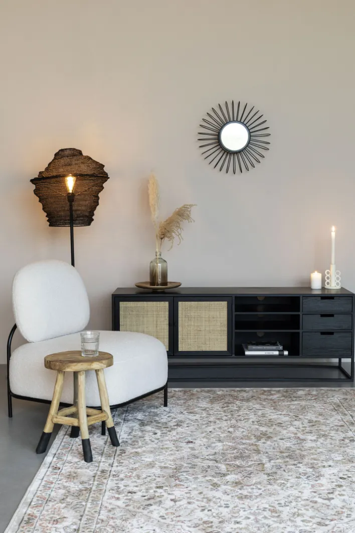 Mit dem 80 x 100 cm großen Highboard JOANNA in Rattangeflecht/ Schwarz erstrahlt der Essbereich im modernen Skandi Look. Gleichzeitig bringt das Möbelstück viel Stauraum in das Zimmer.