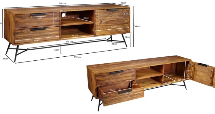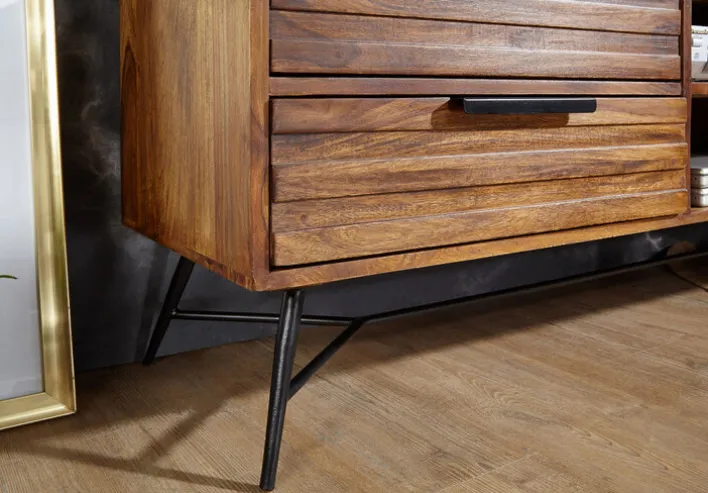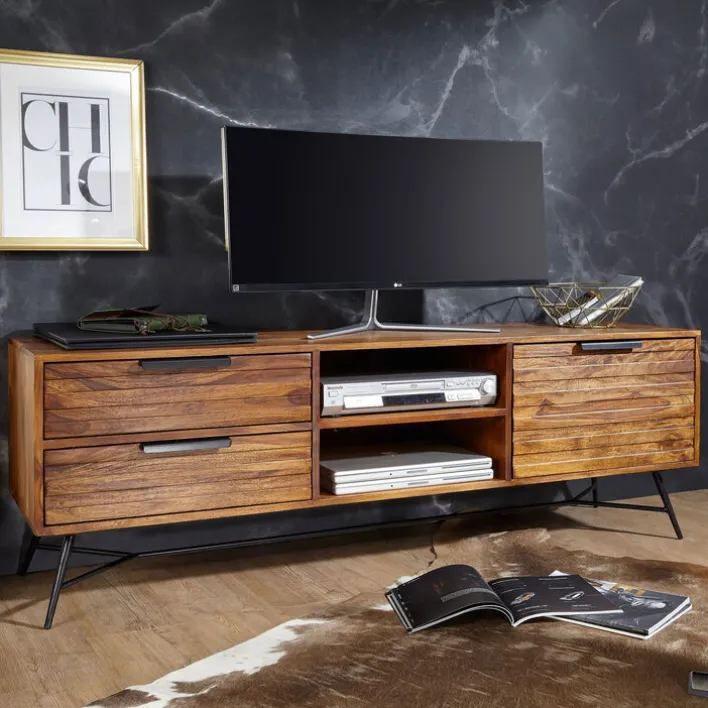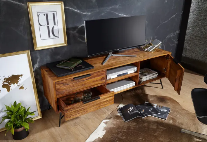 Das braune Lowboard NISHAN mit den Maßen 160 x 54 cm besticht mit einer warmen Holzfarbe und lässt das Wohnzimmer gemütlicher wirken. Gleichzeitig bietet es viel Stauraum für Medienzubehör. Das Lowboard im rustikalen Stil kombiniert das extravagante Vierfußgestell aus matt schwarz pulverbeschichtetem Eisen mit Korpus und Fronten aus gebeiztem Sheesham Massivholz. Dank der Verwendung von hochwertigen Materialien lässt sich das Lowboard mit maximal 30 kg belasten. Somit ist das Abstellen eines großen Fernsehers kein Problem. Zusätzlich zur geräumigen Oberfläche bietet das Lowboard in zwei offenen Fächern, zwei Schubkästen und hinter einer Drehtür viel Platz für Mediengeräte und allerlei Zubehör.